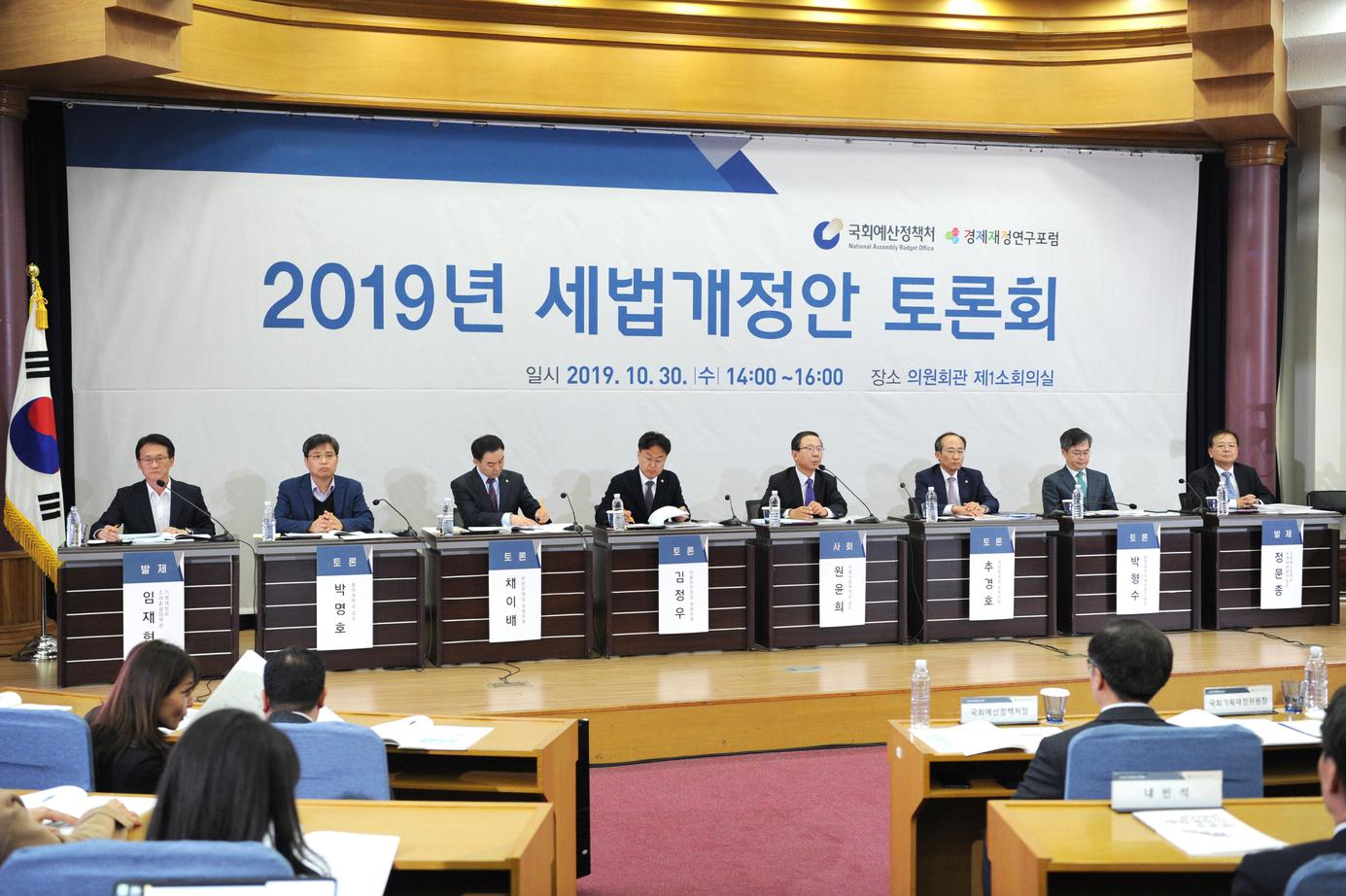 국회예산정책처(처장이종후)는 국회경제재정연구포럼(공동대표 김광림․장병완의원)과 공동으로 10월 30일(수) 오후 2시 의원회관 제1소회의실에서 「2019년 세법개정안 토론회」를 개최하여, 정부 제출 및 의원 발의 세법개정안에 대한 국회심사의 주요한 원칙과 방향을 논의하였습니다.
