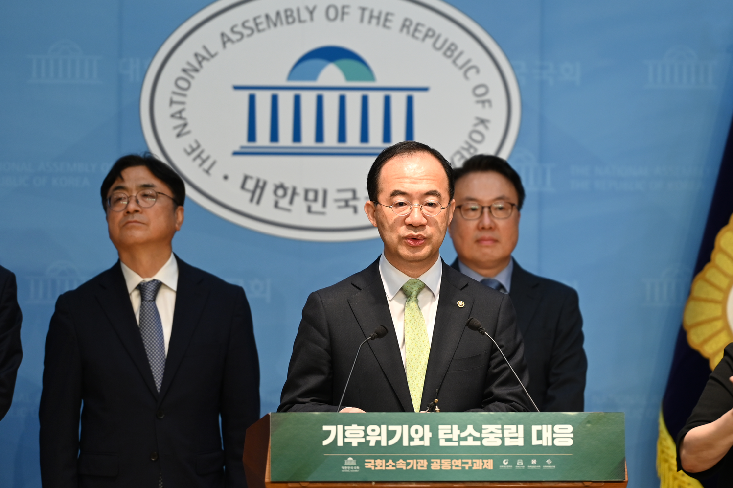 기자회견은 우원식 국회의장의 인사말에 이어 지동하 국회예산정책처장의 보고서 브리핑 순으로 진행되었으며, 기후위기 대응과 탄소중립 달성을 위한 국회 역할을 강조하고 보고서의 주요 내용을 소개하였습니다.