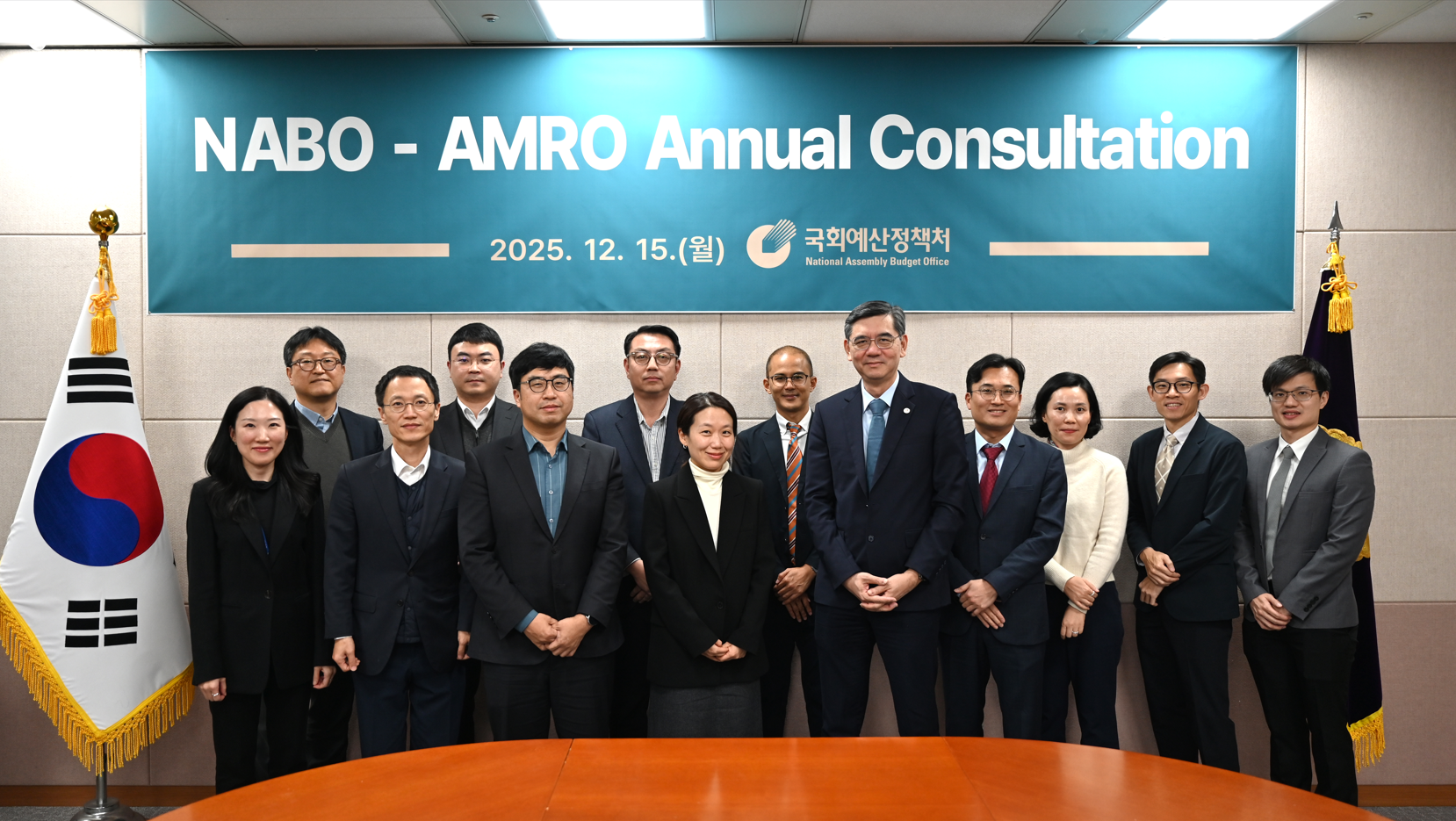 이날 회의에는 국회예산정책처 권아영 추계세제총괄과장과 키안 헝 페(Kian-Heng Peh) 미션단장 등이 참여하였습니다. 국회예산정책처와 AMRO 연례협의단은 한국의 2025년 및 2026년 총수입·총지출 전망, 재정수지 및 부채 전망, 재정의 지속가능성을 위한 재정준칙 도입 논의 현황, 조세·연금·사회보험 개혁 방안, 지방재정 개선 방안 등에 대하여 심도 있는 논의를 나누었습니다.