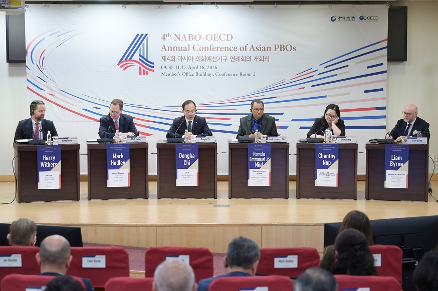 국회예산정책처는 4월 16일(목) 오전 9시 30분 국회 의원회관 제2소회의실에서 경제협력개발기구(OECD)와 공동으로 「제4회 아시아 의회예산기구 연례회의」 개회식을 개최하였습니다. 이번 연례회의는 「국회의원의 재정 이슈에 대한 이해도 증진」을 주제로 4월 15일(수)부터 4월 17일(금)까지 3일간 개최되었습니다.