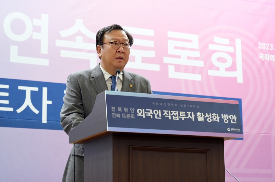 개회식에서 조의섭 처장은 개회사를 통하여 글로벌 경제 여건이 급변하는 상황에서 이번 토론회가 외국인 직접투자를 활성화할 수 있는 실효성 있는 방안을 모색하는 자리가 되기를 희망하였습니다. 김진표 국회의장은 축사에서 어려운 경제상황을 극복하기 위하여 글로벌 자본과 첨단기술 인력 유치를 핵심적인 국가과제로 삼을 필요가 있다고 강조하면서, 외국인 직접투자 활성화를 위한 정책 재설계와 규제 완화가 필요하다고 당부하였습니다.