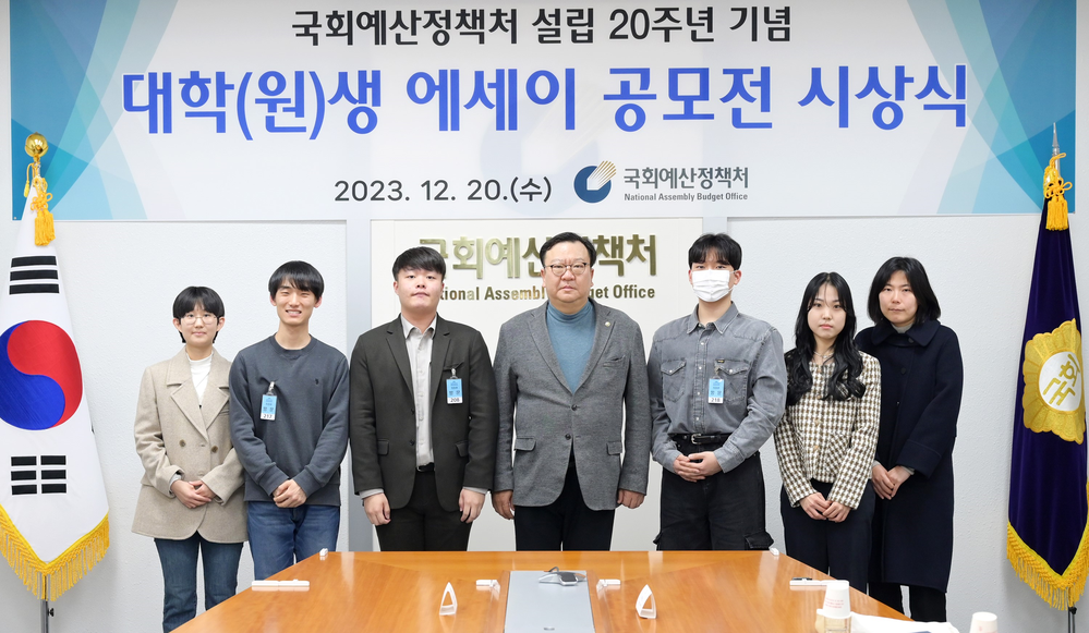 국회예산정책처는 12월 20일(수) 국회 의정관에서 설립20주년 기념 대학(원)생 에세이 공모전 시상식을 진행했습니다. 이번 에세이 공모전은 공교육 개혁, 연금개혁, 청년창업 등 경제·재정 현안에 대한 대학생·대학원생들의 관심과 연구 분위기를 조성하기 위해 마련되었습니다.