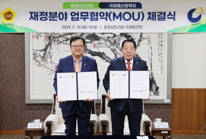 국회예산정책처(처장 조의섭)는 3월 19일(화) 충청남도의회 국제회견장에서 충청남도의회(의장 조길연)와 업무협약을 체결했습니다.