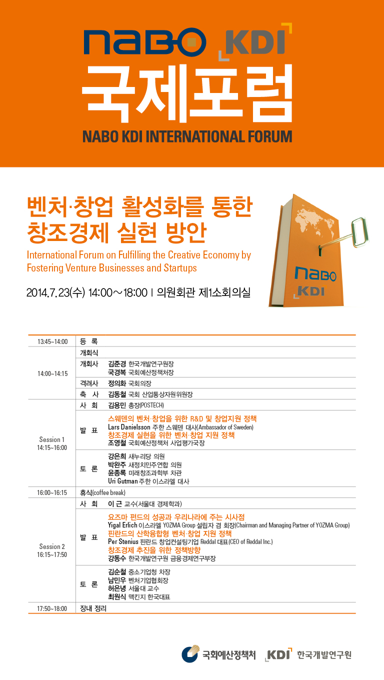  국회예산정책처(처장 국경복)는 KDI(원장 김준경)와 공동으로 오는 7월 23일(수) 오후 2시 국회 의원회관에서 "벤처·창업 활성화를 통한 창조경제 실현 방안"을 주제로 국제포럼을 개최함.